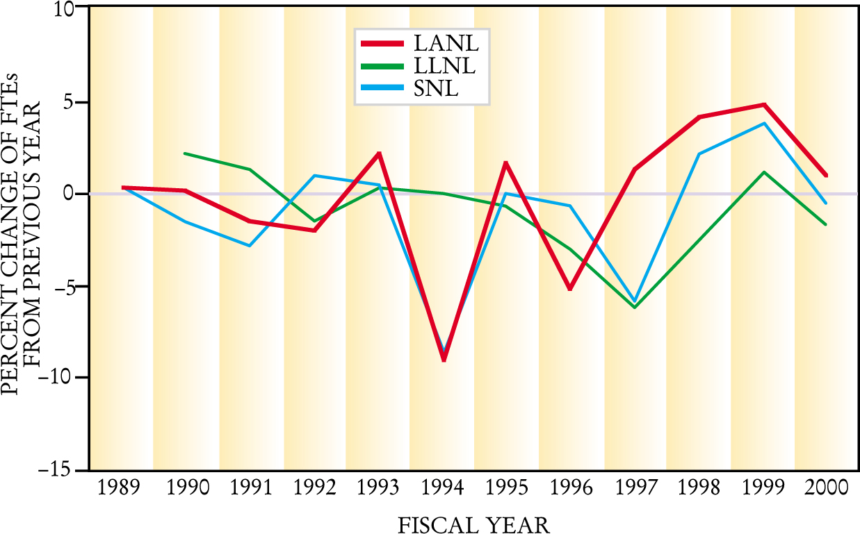 Figure 3. Looming leadership vacuum. The 5% loss of science and technology full-time-equivalent (FTE) staff in DOE’s defense labs, most apparent in 1994, 1996, and 1997, corresponds to a loss of more than 1200 trained people. Such losses lead to a significant reduction of available talent among 25- to 35-year-olds, from which leaders would normally be drawn 10–15 years later.