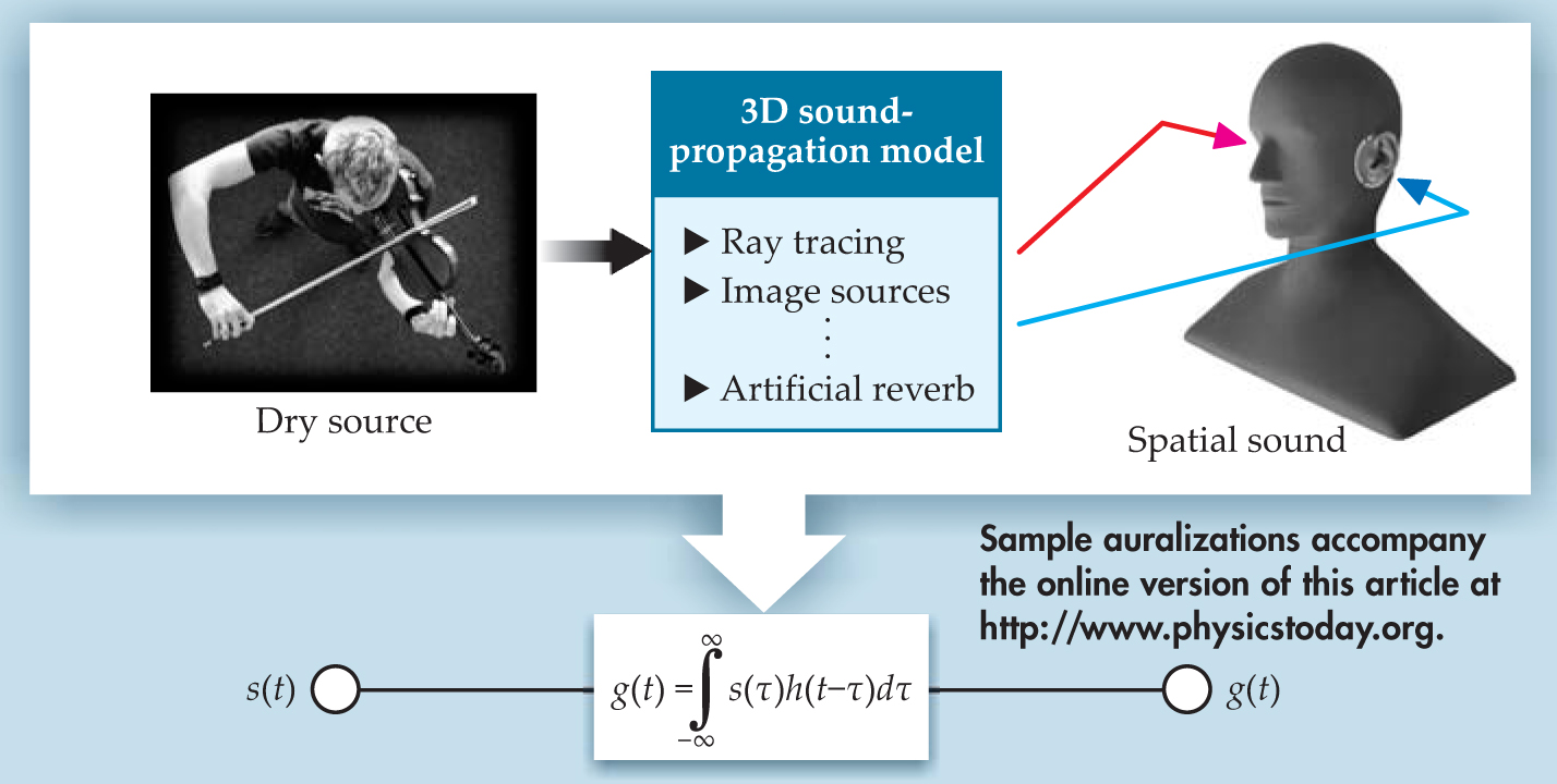 In auralizing spaces, one tries to simulate the effect that rooms have on sounds. Concert-hall acoustics serves as an example to understand the sound heard from a musical instrument. Without the room, the sound would be weak in intensity and poor in musical expression. The room is part of the musical experience: It adds strength and reverberation and makes the sound “spatial.” The difference between the so-called dry instrument sound and the sound in a room is the focus of architectural acoustics, a discipline founded some 100 years ago by Wallace Clement Sabine based on his studies of Boston’s Symphony Hall. 1 Today, architectural acoustics, its physics, and its hearing psychology are well understood in principle.