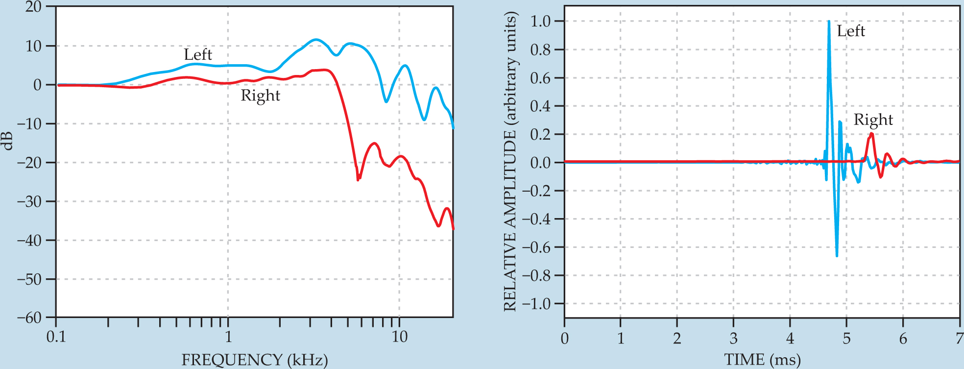 Figure 3. Sound goes binaural. Diffraction and reflection by the head and torso cause the sound field at the left and right ears to be different. Those effects are represented by head-related transfer functions. Filtering of monaural signals with HRTFs creates three-dimensional sound images. The transfer functions are usually defined in polar coordinates for the plane waves incident in a given direction. (a) A sample HRTF magnitude for the right (red) and left (blue) ears. (b) The corresponding, normalized head-related impulse responses, the inverse Fourier transform of the HRTFs. The HRIRs illustrate the amplitude and time difference of sound arriving at the ears. In this example, the sound is incident from the left side of the listener.