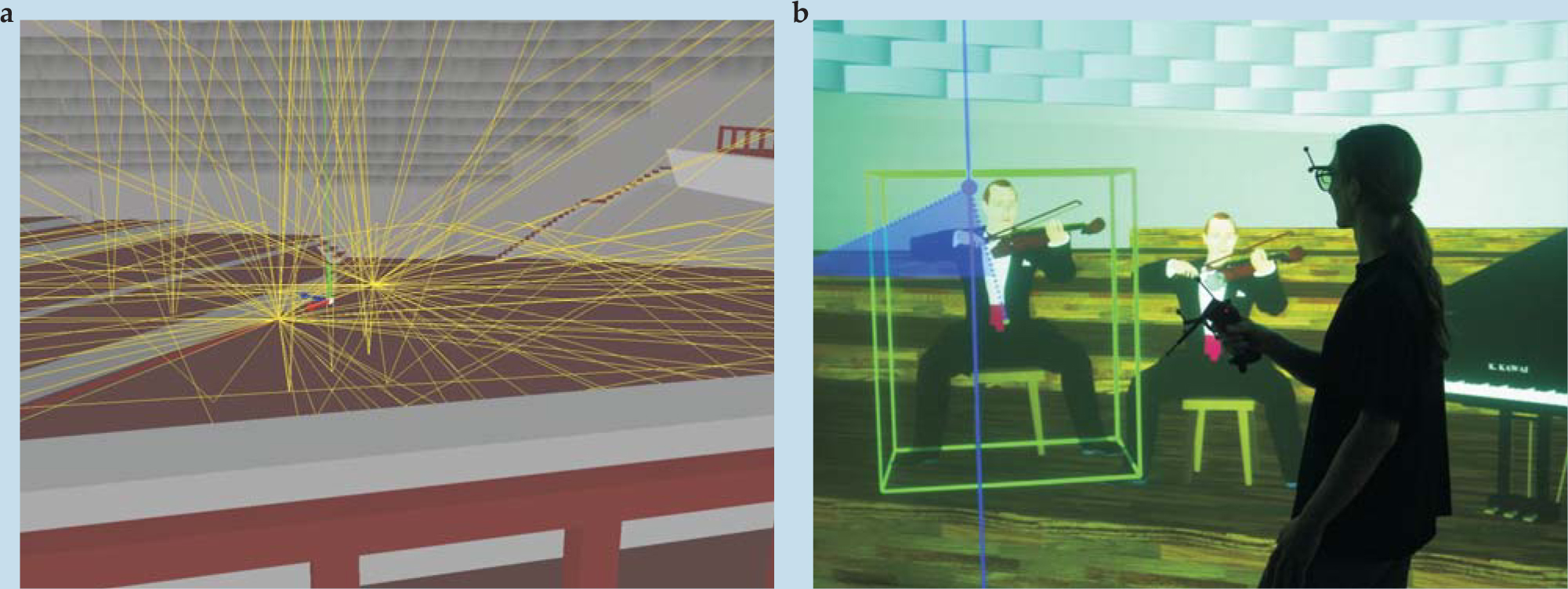 Figure 4. Virtual room acoustics. Integration of virtual reality and acoustics in a virtual concert hall. (a) The paths in yellow are calculated to be audible for a certain virtual listening position. (b) In an interactive virtual reality, such as this CAVE-like environment, the auralization needs to be updated every time the listener’s position or head orientation changes. The Cave Automatic Virtual Environment was first presented by Carolina Cruz-Neira and colleagues at the University of Illinois.