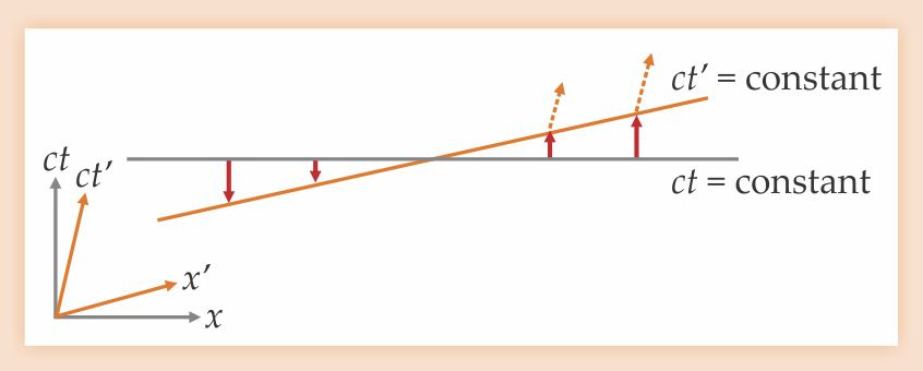 Figure 1. A Lorentz boost, which changes an observer’s velocity, implies a transformation of constant-time spatial slices of spacetime. The t′ = 0 surface of a boosted observer is related to the t = 0 surface of the stationary observer by a linear deformation T(N): Each point x on the t = 0 surface is shifted by a distance N(x) = vx/c along the normal direction. Note that normal vectors are drawn according to Minkowski geometry, parallel to the time axes, so a subsequent boost would involve deformations in the direction indicated by the orange, dotted arrows.