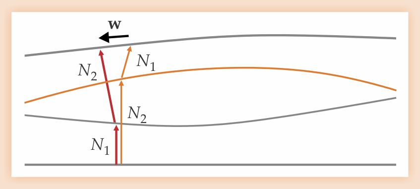 Figure 3. General relativity allows for nonlinear coordinate changes, which correspond to arbitrary deformations S(w) within spatial slices and arbitrary temporal deformations T(N), with functions N determining the shift along the normal at every point. The example shown here generalizes figure