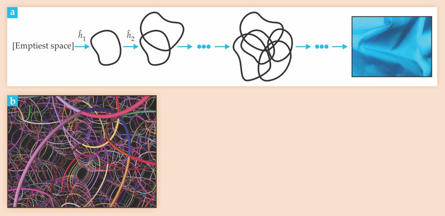 Figure 4. Starting with emptiest space in its state ψ0, ladder operators ĥi in loop quantum gravity generate geometry. (a) As illustrated in this schematic, the geometry is atomic and polymer-like, with complicated meshes building space on small scales. Only on distances much larger than the mesh spacing does general relativity’s curved continuum emerge. (b) The spin network presented in this simulation is a more rigorous way to represent multiple applications of ladder operators. Different colors here represent different degrees of excitation.