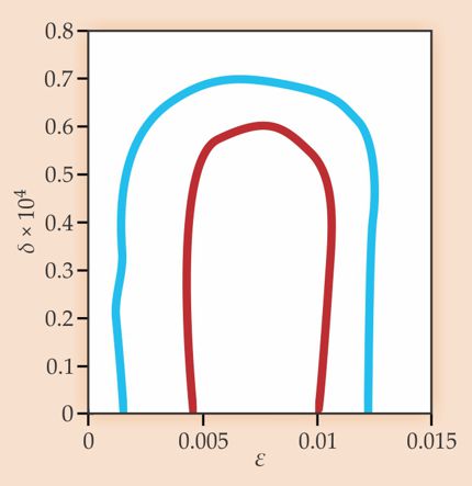 Figure 5. Observations of the cosmic microwave background and other data limit the size of the inverse-volume correction δ = α − 1 (see equation 2). This likelihood plot combines δ with a parameter ε that distinguishes between various possibilities for cosmic inflation. The lines bound regions in which δ and ε must lie with a likelihood of 68% (red curve) and 95% (blue curve). The upper bound here is about four orders away from a theoretical limit δ = 10−8 below which the discrete spacetime theory used to generate the curves is no longer consistent. As the cosmological data improve, the consistency of discrete spacetime theories will come under ever more rigorous observational scrutiny. (Figure by Shinji Tsujikawa, Tokyo University of Science; adapted from ref.