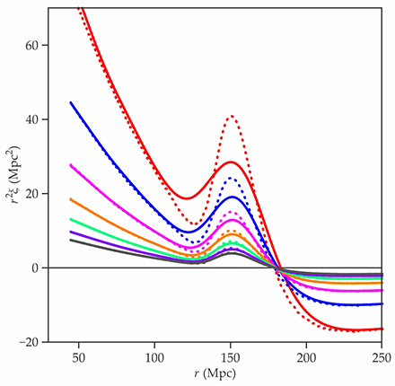 The correlation function relates the density of matter at two points separated by a distance . In this plot, created with the routine RegPT,13 is a comoving coordinate; points with fixed flow with the expansion of the cosmos. To make large separations clearer, the correlation function has been multiplied by . Each pair of curves, one dotted and one solid, represents a different redshift z, whose value is zero today and increases in older slices of the cosmos. Reading the curves from top to bottom, z increases from 0 to 3.0 in increments of 0.5. The baryon acoustic oscillations (BAOs) feature—the bump at an of about 150 megaparsecs (Mpc)—can be seen clearly at all redshifts. The dotted lines show the expected evolution as if bulk motions had not damped the BAO signal, whereas the solid lines show the expected signal after damping. On small scales, clustering increases with cosmological evolution and is evidently strongest at the present day. Also, as expected, the damping increases as the age of the universe increases and z decreases.