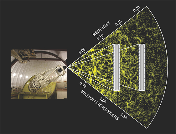 To observe BAO, we astrophysicists need surveys of galaxies that cover volumes of many cubic gigaparsecs and include many hundreds of thousands of galaxies. The angular positions of galaxies are relatively straightforward to obtain, but turning angular positions into a three-dimensional map is more difficult. We obtain the radial information from the redshift in the light from the distant galaxies. It is possible to obtain an approximate measurement of the redshift from the broadband color of a galaxy, but to obtain an accurate redshift, we need a spectrum from which emission and absorption features with known rest-frame wavelengths can be accurately measured.