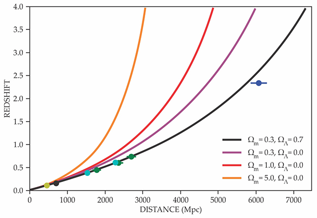 The standard cosmological model includes matter and dark energy acted on by gravity as described by the general theory of relativity. The curves here show redshift versus distance for different recipes of matter density (Ωm) and of dark-energy density (ΩΛ), which is taken to be Einstein’s cosmological constant. Note that the densities are given in terms of dimensionless Ω symbols normalized such that Ωm + ΩΛ = 1 corresponds to a spatially flat universe. Data from a handful of baryon acoustic oscillation surveys (colored dots) consistently support a spatially flat cosmos with Ωm = 0.3 and ΩΛ = 0.7. See reference 9 for details of the data plotted.
