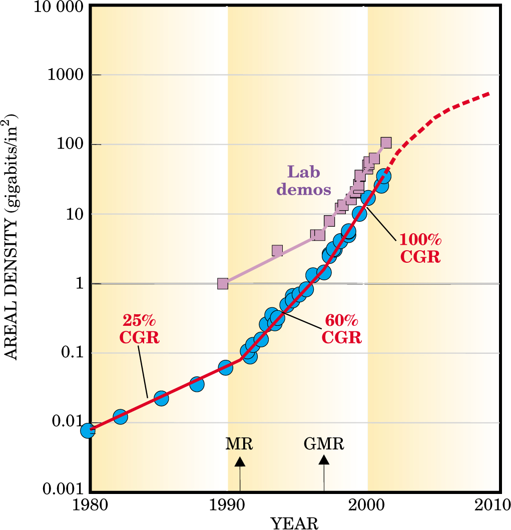 When tracking various improvement trends over many years or decades, one can find rather abrupt increases in the exponential doubling rate. Such marked discontinuities are often the signature of a major invention. As shown in figure 1, for example, the introduction of magnetic read-head sensors based first on new magnetoresistive materials and later on giant magnetoresistance (GMR) materials and structures marks abrupt increases in the compound growth rate of hard-disk-drive areal storage density.