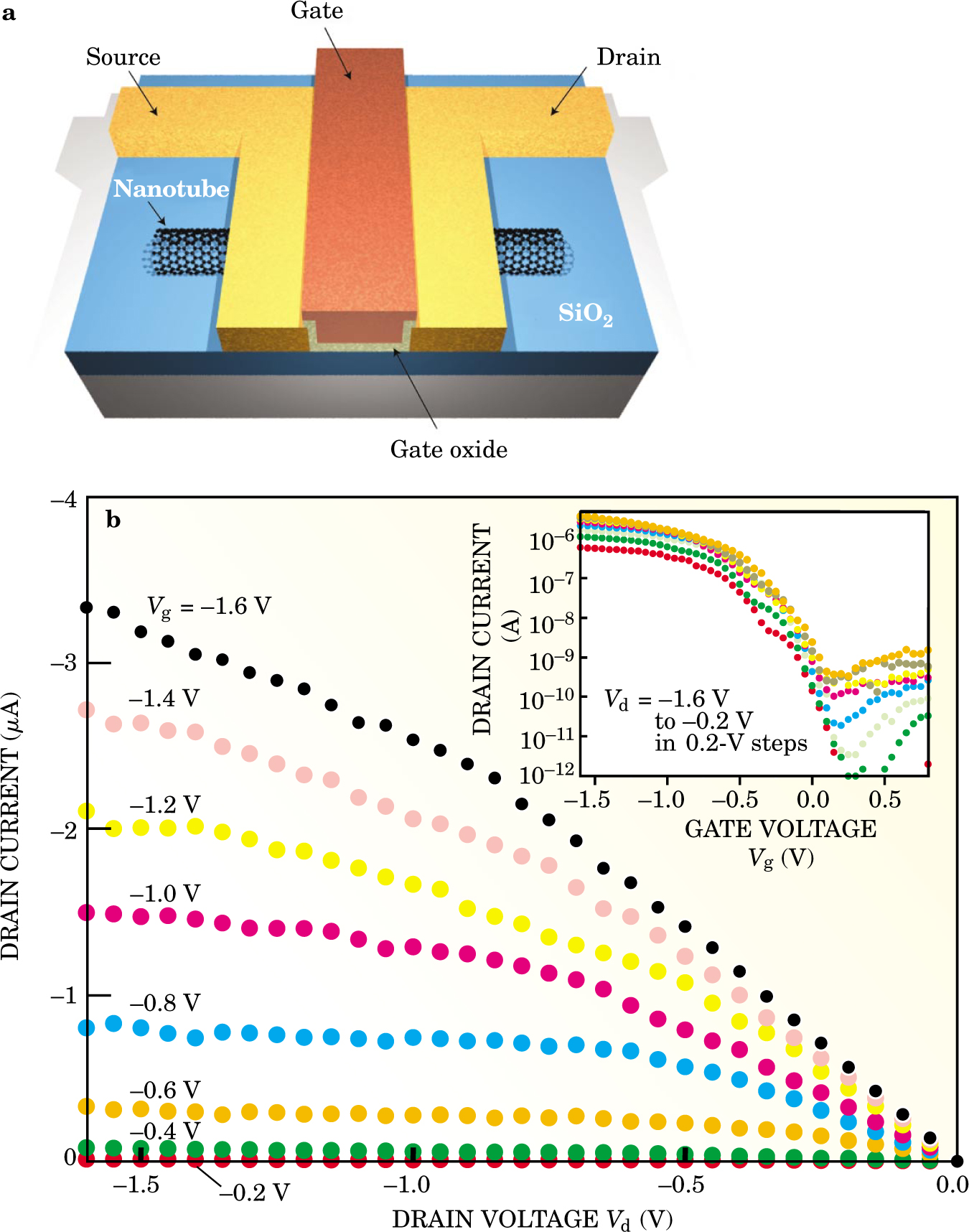Figure 3. The carbon nanotube transistor shows potential to someday compete with the silicon transistor as a fast logical switch. (a) This drawing schematically illustrates an experimental carbon nanotube transistor. A potential applied to the overlying gate electrode controls the injection of charge carriers from the source or drain electrode into the nanotube. Although the arrangement shown is similar to that of an Si field-effect transistor, the recently elucidated physics of charge injection and transport (see ref. 4) is quite different. (b) The device characteristics show that a single nanotube, approximately 1.4 nm in diameter and gated by an electrical potential Vg on the order of 1 volt, is capable of modulating several microamperes of current. Such modulation is remarkable for a switching device with so narrow a conducting channel. It would be comparable to that of the best exploratory Si transistors if they could be scaled to similarly narrow widths. Further improvements in the contact metallurgy and geometry of the device may result in a switch with impressive high-frequency performance. Nevertheless, the applications of carbon nanotube transistors will be limited unless practical manufacturing processes can be developed. Many laboratories are currently pursuing the improved synthetic paths and methods of chemical self-assembly that will be necessary.