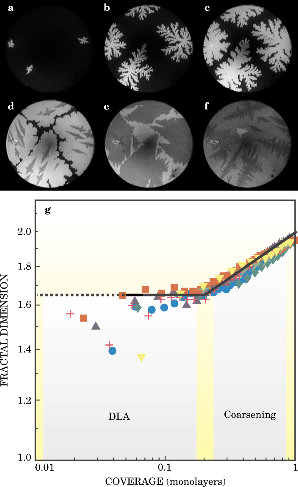 Figure 4. The growth of a single monolayer crystal of pentacene can be followed in real time with a low-energy electron microscope (LEEM). Molecules of pentacene, an organic semiconductor, are vacuum deposited on a crystalline silicon surface and agglomerate into a dendritic crystal by diffusion-limited aggregation (DLA). Images (a) through (c) show the nucleation and growth of the first molecular layer; (d) through (f) show nucleation and growth of the second and third layers. Scientists strive to create conditions that result in monolayers with a large lateral dimension (about 50 µm here) because the elimination of numerous grain boundaries results in organic semiconducting films with higher carrier mobility. In general, a basic understanding of the mechanisms of crystal nucleation and surface diffusion is extremely valuable in guiding the experimental fabrication of organic and molecular electronic devices. (g) The fractal dimension of single-monolayer pentacene islands depends on the degree of coverage. But, independent of the experimental conditions, including growth rate variations and substrate surface preparation as illustrated by the different colors and symbols, the fractal dimension follows a universal curve once the coverage exceeds about 0.05 monolayer.