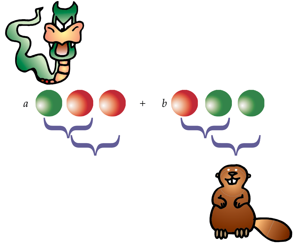 When the beaver wants to measure the collective observable, he first prepares a third (“ancilla”) qubit in the red state . Then a quantum circuit is executed in which two successive controlled-NOT gates are performed, each with the ancilla as the target and with the successive qubits and as the controls. If qubits and have the same color, the color of the ancilla qubit is flipped either zero times or twice, so it is still red when measured; but if qubits and have different colors, there is only one flip, and the ancilla becomes green. Measuring the ancilla reveals only the collective property, not the colors of the two individual qubits.