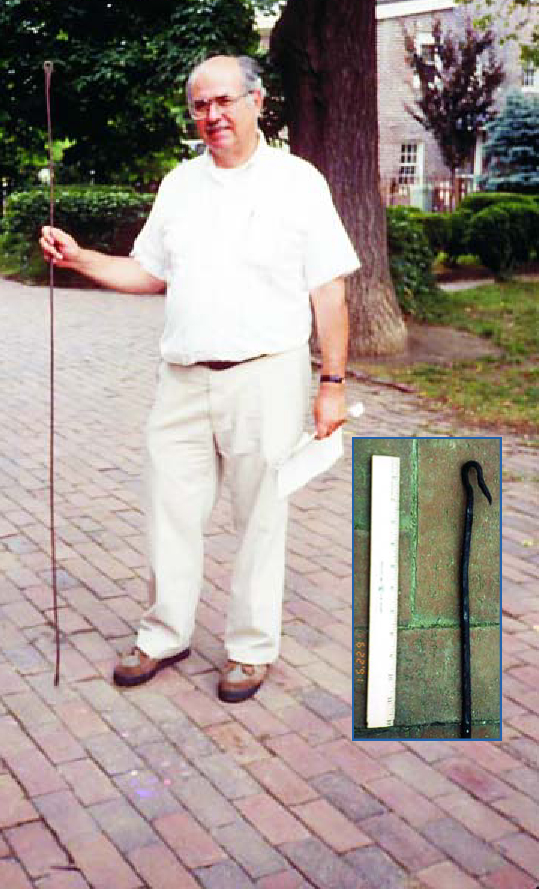 Figure 4. David B. Rivers, pastor of the Gloria Dei (Old Swedes’) Church in Philadelphia, holds a section of the original iron conductor that protected the church. The upper links in the chain were stapled to the inside of a wooden steeple. The inset shows how a mechanical link may have been ruptured, its hook forced open by an explosive arc during a lightning strike.