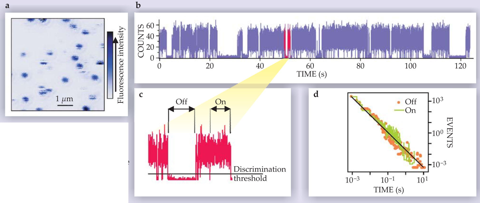 Figure 1. Fluorescence blinking of colloidal quantum dots. (a) Confocal fluorescence image of individual QDs. (b) Two-minute fragment of a time trace of the emission of a single QD. The blinking can be readily observed. (c) A two-second zoom-in. The horizontal line marks the threshold used to discern the off state from the on state. (d) The distribution of times in the on and off states. The line is a power law (equation