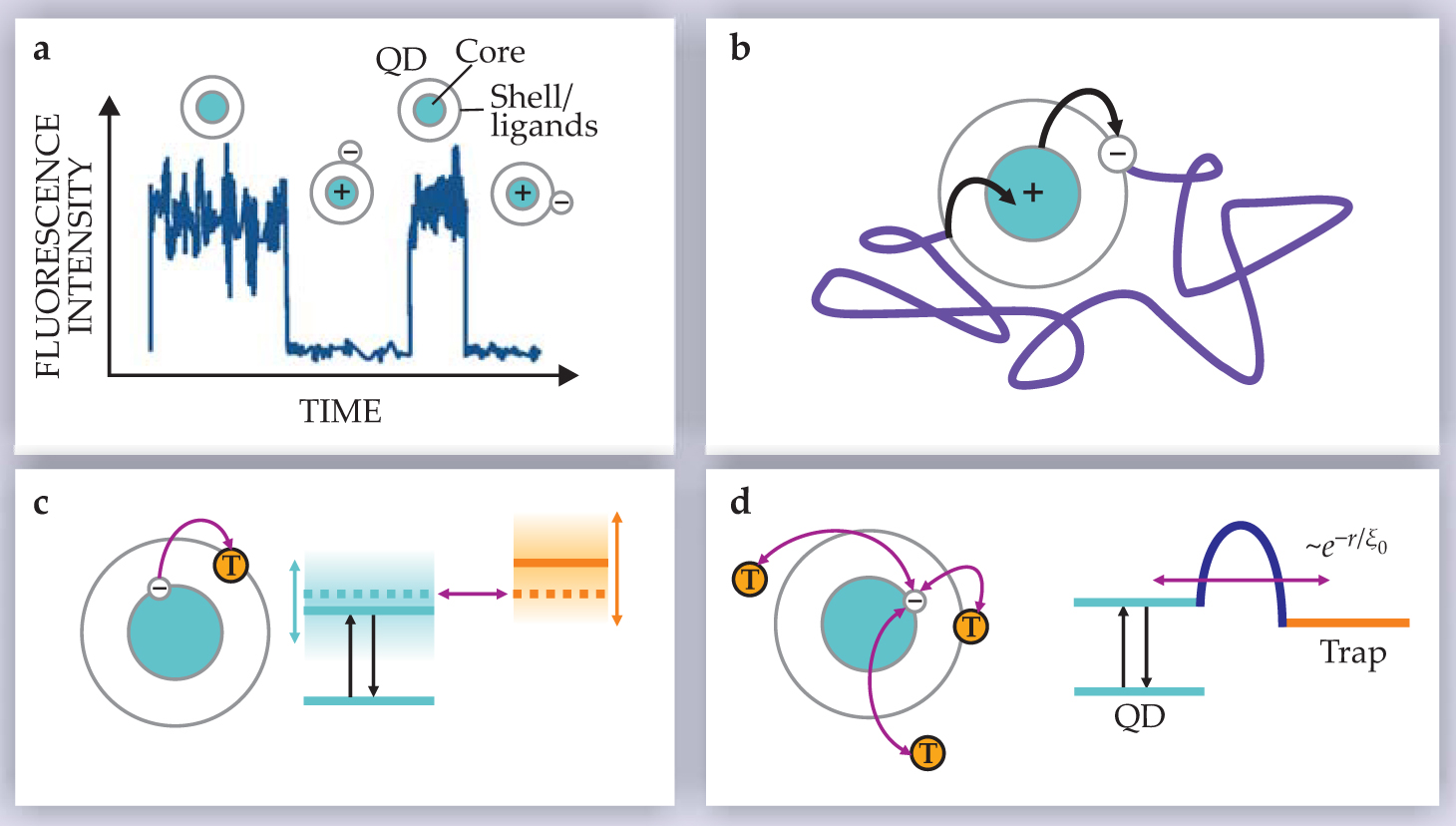 Figure 2. Models for power-law blinking based on charge separation. (a) The charged-dot hypothesis states that a neutral quantum dot is fluorescent and a charged dot is dark. The different models attempt to explain the blinking statistics by proposing mechanisms by which a QD may eject or recover a charge carrier; the carrier is depicted here as an electron, but it could equivalently be a hole. (b) An electron ejected from the QD will diffuse three-dimensionally, but the Coulomb interaction will restrict it to the vicinity of the positively charged QD core. (c) An electron can escape the QD through resonant tunneling when the energies of the QD excited state and a trap (T) match. Random fluctuations in the energy of those levels lead to a power-law distribution of on and off times. (d) Tunneling through a barrier to one of multiple traps gives rise to a power-law distribution of off times through the exponential dependence of tunneling probability on the distance r to the trap.