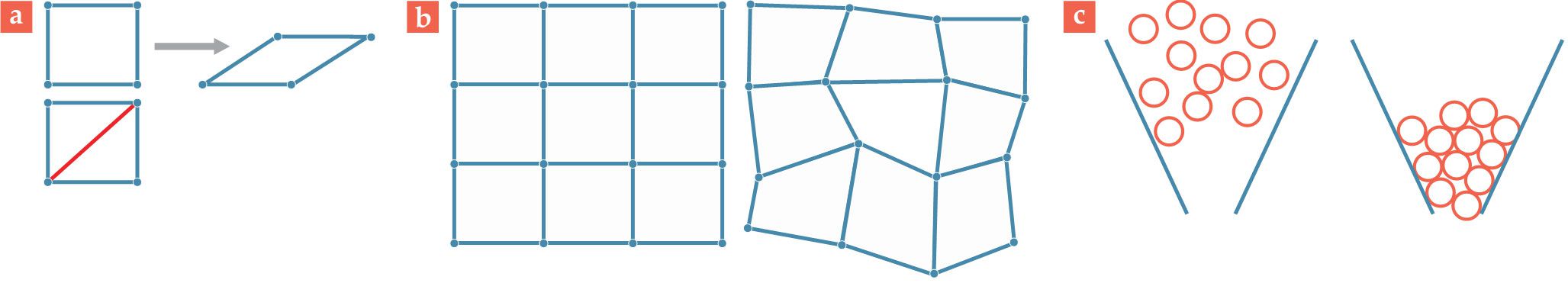 Frames and forms. (a) With fewer constraints than degrees of freedom, the top frame is floppy and collapses when pushed. With an additional rod (red) on the diagonal, the bottom frame has an additional constraint, such that the structure remains rigid under pressure. (b) The crystalline solid on the left has vertices (atoms) embedded in a regular grid. The vertices in the amorphous solid on the right do not lie on a lattice. (c) The configuration of particles in the left panel allows them to flow. On the right, the particles are in a jammed, solid-like configuration.