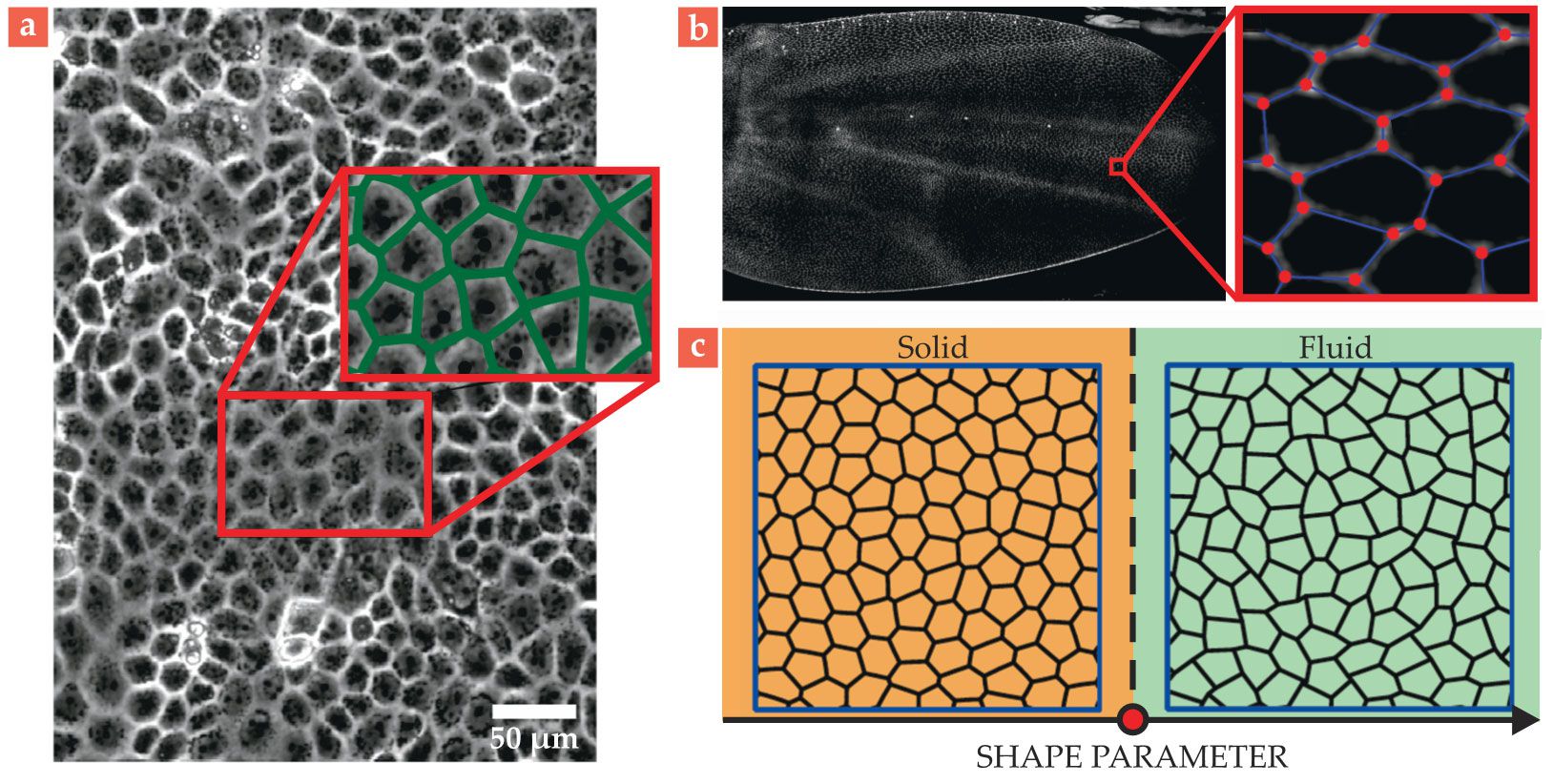 Vertex models for epithelial tissue. (a) A layer of tissue showing the cell membranes. The inset pictures a Voronoi tiling (green edges) constructed using the cell centers. The constructed edges, each consisting of points equidistant from the nearest cell centers, almost exactly match the cell boundaries. (Adapted from M. L. Zorn et al., Biochim. Biophys. Acta Mol. Cell Res. 1853, 3143, 2015, doi:10.1016/j.bbamcr.2015.05.021