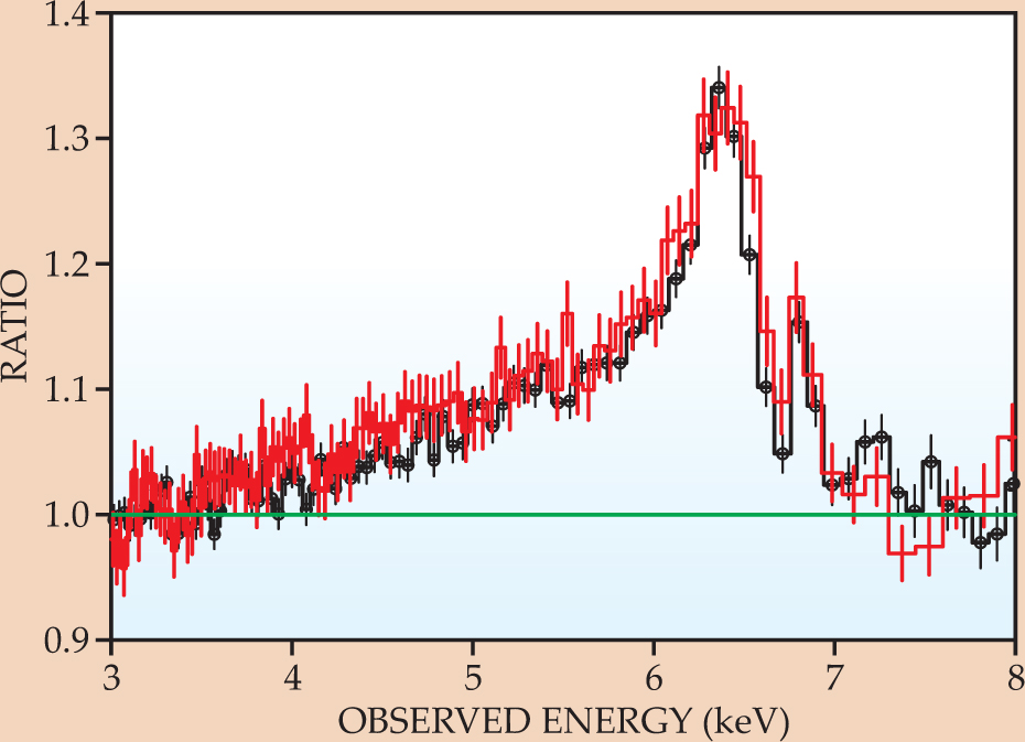 Figure 1. A relativistic disk line from an iron K transition as revealed in x-ray spectra of the active galactic nucleus MCG-6-30-15. The data were obtained with the Suzaku (black) and XMM-Newton (red) observatories. The speed of particles in orbit around a black hole can approach that of light, and special-relativistic beaming combines with the Doppler effect to create an asymmetric emission line profile. Some of the x-ray light is observed with an energy well below the transition’s rest energy of 6.4 keV because of energy losses experienced while escaping from the strong gravitational potential. Such lines are powerful tools to explore the predictions of general relativity. To display the line clearly, its flux is shown as a ratio to the continuum flux obtained from a well-determined continuum model.
