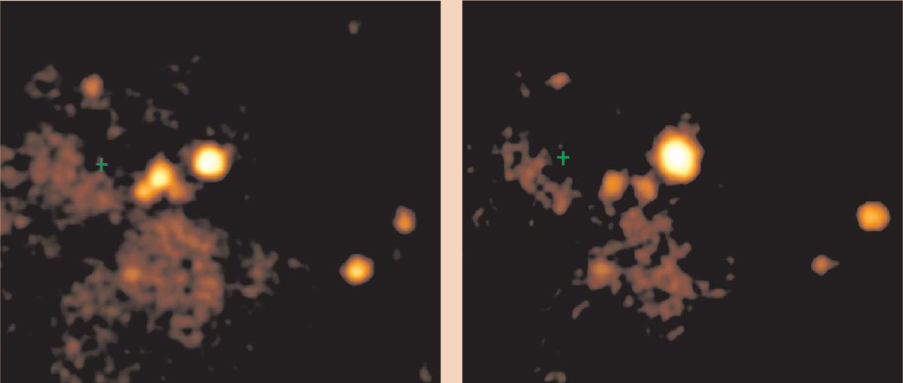 Figure 2. The central region of the galaxy M82, as depicted in two x-ray images obtained from the Chandra X-ray Observatory. The green cross indicates the center of the galaxy as determined by gaseous and stellar dynamics. A variable x-ray source is clearly evident near the middle of the images. The off-galactic-center location of the source, its peak x-ray luminosity, and its variability characteristics suggest that it is an intermediate-mass black hole. Each image represents a window approximately 30 arcseconds across; the intermediate-mass black hole is at least 600 light-years from the center of M82.