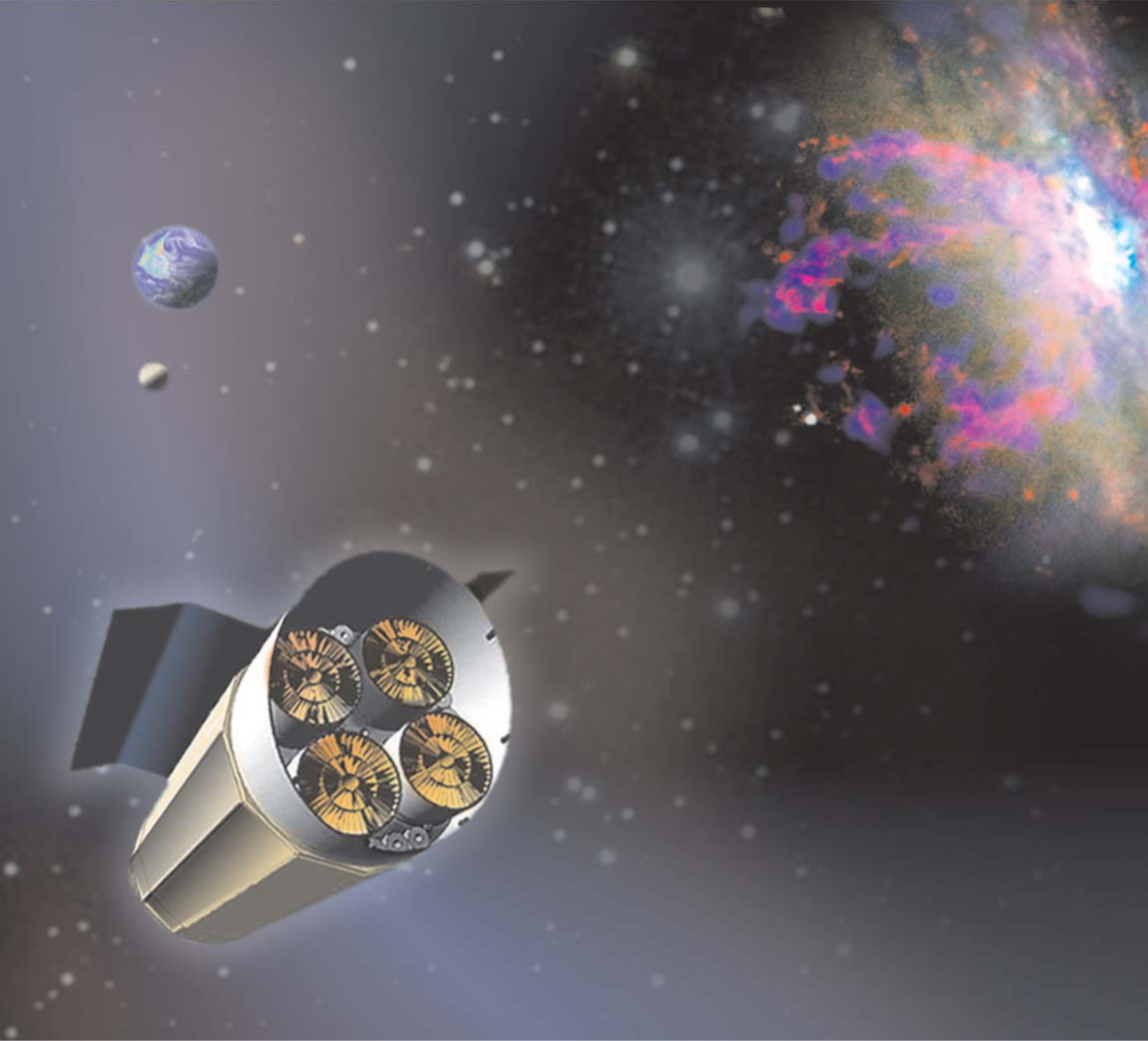 Figure 3. Space-borne Constellation-X , in an artist’s rendition. This planned successor to the Chandra X-ray Observatory will focus on the spectroscopy and cosmic evolution of black holes. Its main unit will be approximately 10 m in length and 4.5 m in diameter and will house four independent x-ray telescopes.