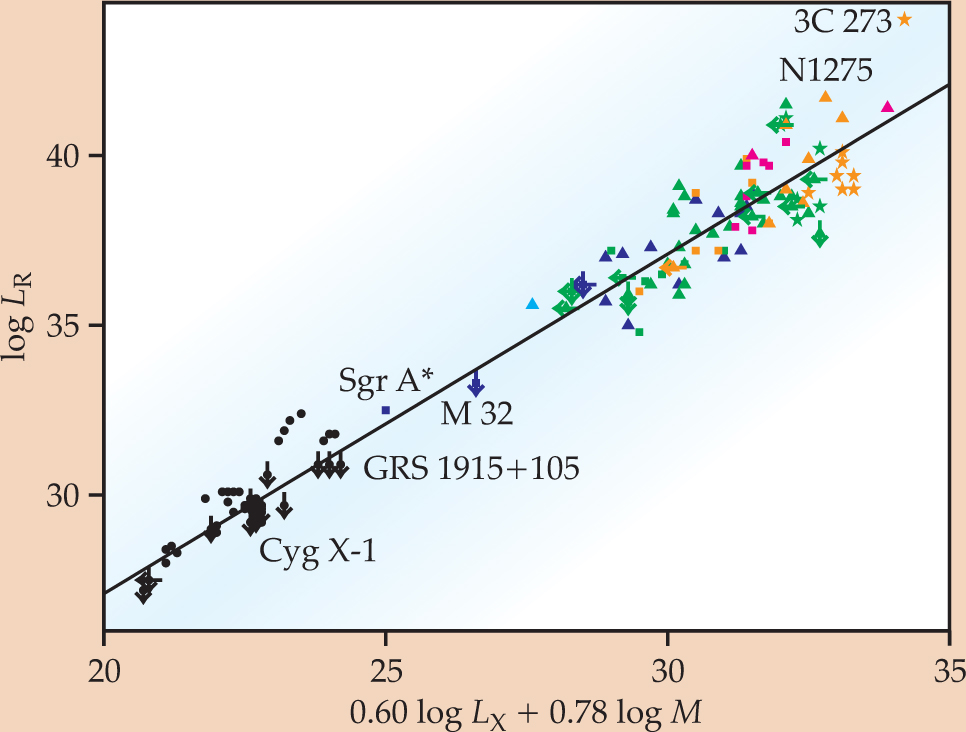 Figure 4. The fundamental plane of black hole activity. Black holes convert a specific fraction of accretion energy into radiation, traced by the x-ray luminosity L X, and jet kinetic energy, traced by radio-emission luminosity L R. The plot shown here includes black holes that inhabit four distinct classes: stellar-mass black holes (circles), low-ionization nuclear emission line regions and transition objects (diamonds), Seyfert active galactic nuclei (triangles), and quasars (stars). Black hole masses M, measured in units of the solar mass and indicated by color, range over more than seven orders of magnitude. Luminosities are in erg/s.
