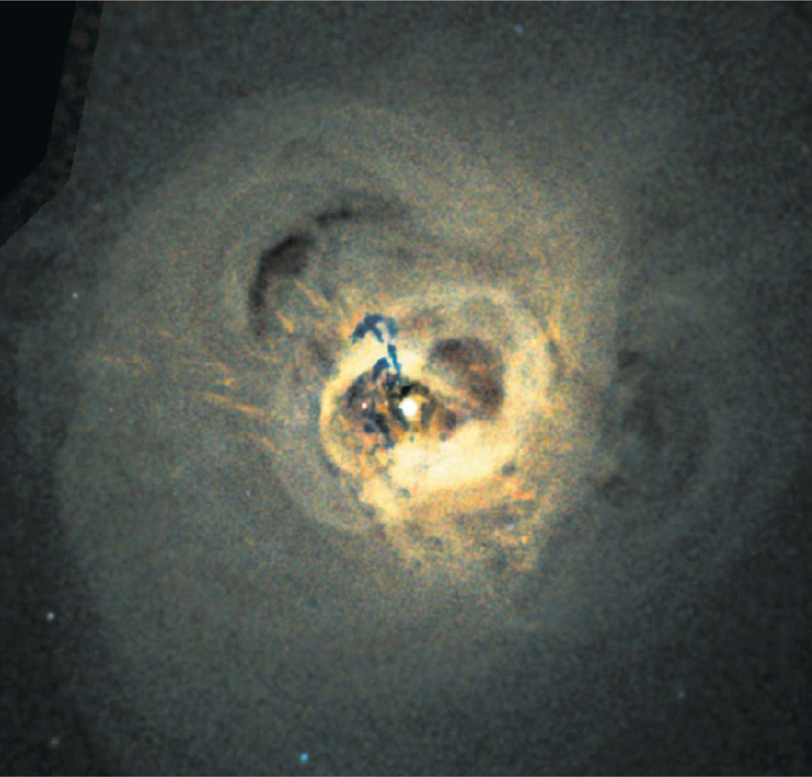 Figure 5. The Perseus cluster of galaxies, as seen in a Chandra X-ray Observatory image. The clearly visible shocks and ripples in the hot intracluster gas arise from powerful outbursts of the supermassive black hole at the heart of the central galaxy, Perseus A. The figure represents a window 4.7 arcminutes across, and the most distant shocks have traveled approximately 300 000 light-years from the black hole.