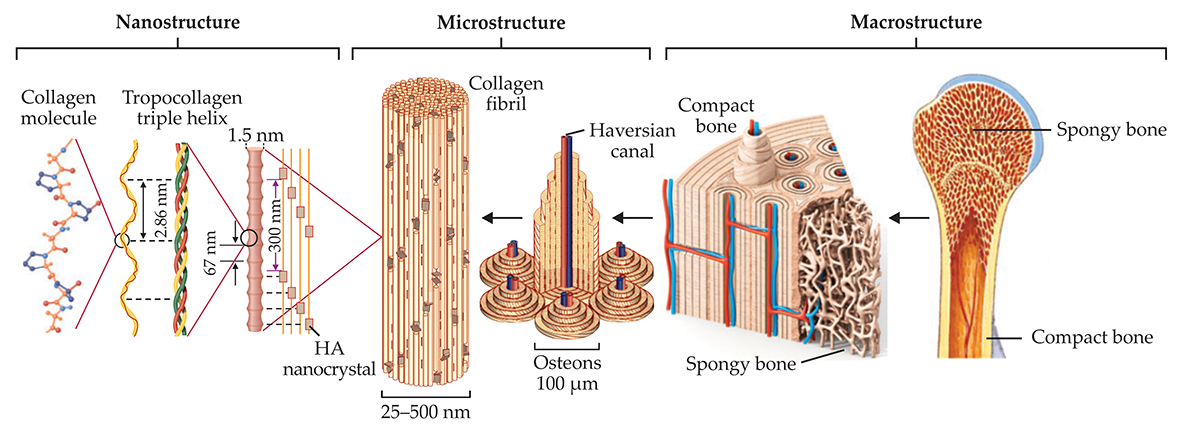 Figure 1. Bone’s intricate hierarchy. Bone consists mostly of collagen protein molecules and the mineral hydroxyapatite (HA). The collagen molecules intertwine to form strands of tropocollagen, which in turn align to form overlapping regions periodically separated by small gaps. Nanocrystals of HA populate the gaps with their axes aligned along the length of the tropocollagen strands. Many mineralized strands combine to make a fibril, the building block for higher-level architectures such as the fibers and cylindrical lamellae that form osteon structures in compact bone. Along the center of each osteon runs a Haversian canal, responsible for supplying the tissue with blood. At macroscopic length scales, two types of bone tissue are evident: compact bone, which forms an outer shell, and trabecular or spongy bone, found in the interior. That hierarchical organization makes bone simultaneously strong and lightweight. (Adapted from ref.