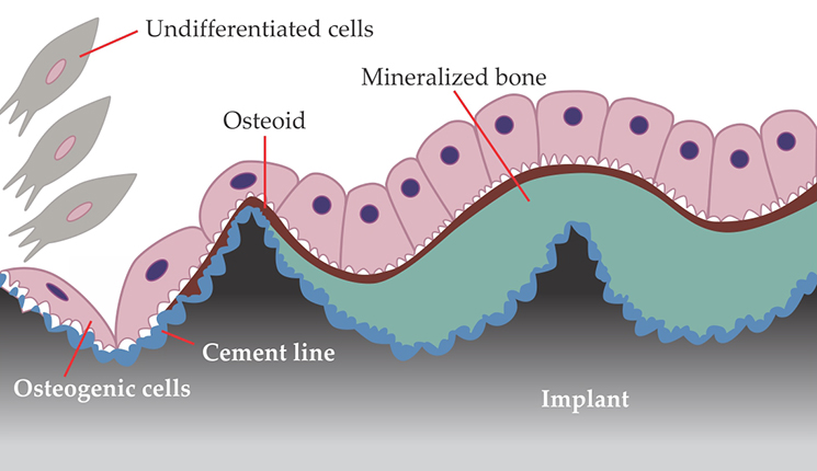 Figure 2. Bone bonding at an implant surface. New bone tissue grows along an implant, from right to left in this illustration, when undifferentiated cells are recruited to the implant’s surface, roughened at nanometer length scales to improve bone–implant bonding. There, the cells become bone-producing osteogenic cells, which sequentially secrete a mineralized matrix that forms the so-called cement line (blue) and a bone precursor substance known as osteoid (red). Ensuing mineralization of the osteoid produces woven bone (green). (Adapted from ref.