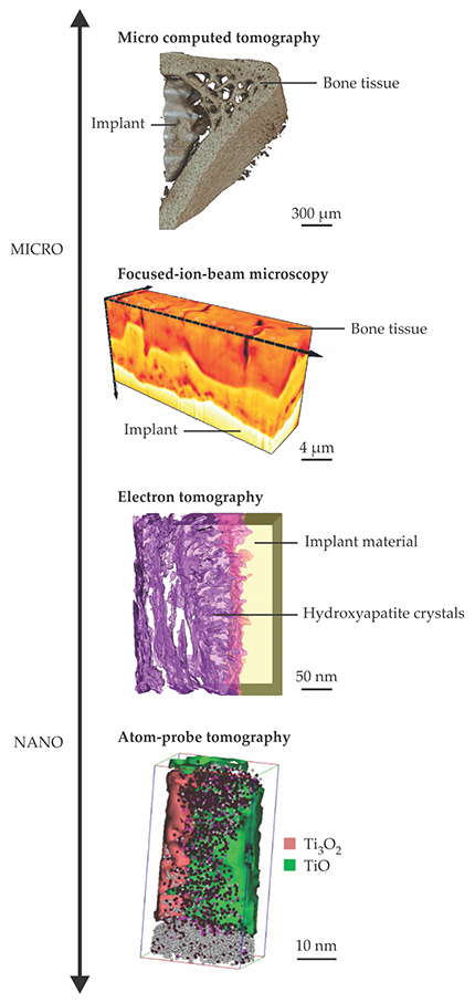Due to both the inhomogeneity of the bone tissue near an implant interface and the complexity of today’s implant surfaces, however, a comprehensive understanding of bone–implant bonding demands techniques that are 3D in nature. With 2D techniques, for instance, the contact area between bone tissue and an implant is estimated by looking at a cross-sectional slice through the specimen. But results obtained that way can vary greatly depending on where the slice was made. Furthermore, the bone’s hierarchical structure necessitates techniques capable of probing a large range of length scales. The most effective approaches combine several 3D methodologies in what’s known as correlative microscopy. Figure 3 highlights some of those techniques and the architectures they probe.
