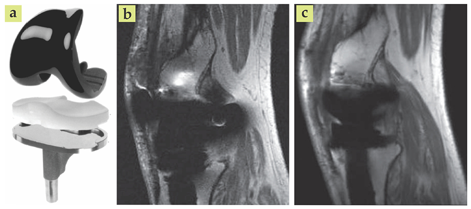 Figure 4. Metal-based implants, such as an artificial knee (a), often appear distorted in magnetic resonance images. The sharp difference between the magnetic susceptibilities of bone and metal creates magnetic field gradients that result in unfaithful images (b). Advanced imaging techniques and postprocessing algorithms can yield vastly improved results (c). (Adapted from ref.