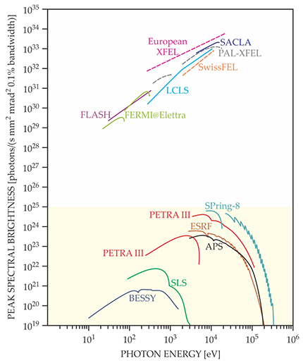 In SASE, the radiation experiences exponential growth as the electrons in the beam self-organize into microbunches. At FEL saturation, one electron can spontaneously emit about 103–104 photons. With about 109–1010 electrons in a bunch, SASE x-ray pulses can have about 1012–1014 coherent photons. Figure 1 compares the brightness of FELs with those of some synchrotron radiation facilities.