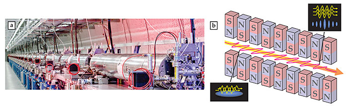 Figure 2. The 132-m undulator consisting of 33 individual segments (a) is the heart of the Linac Coherent Light Source. (b) This illustration shows the electrons’ sinusoidal path (red wavy line) in the magnetic field of the undulator’s array of permanent magnets with alternating north and south poles. The yellow arrow indicates the emitted photons. The x rays emitted by different electrons when they first enter the undulator are not coherent (lower left). In self-amplified spontaneous emission, the electrons interact with their own emissions and self-organize into microbunches (upper right) that wiggle synchronously to produce a coherent x-ray laser pulse. (Photo courtesy of SLAC.)