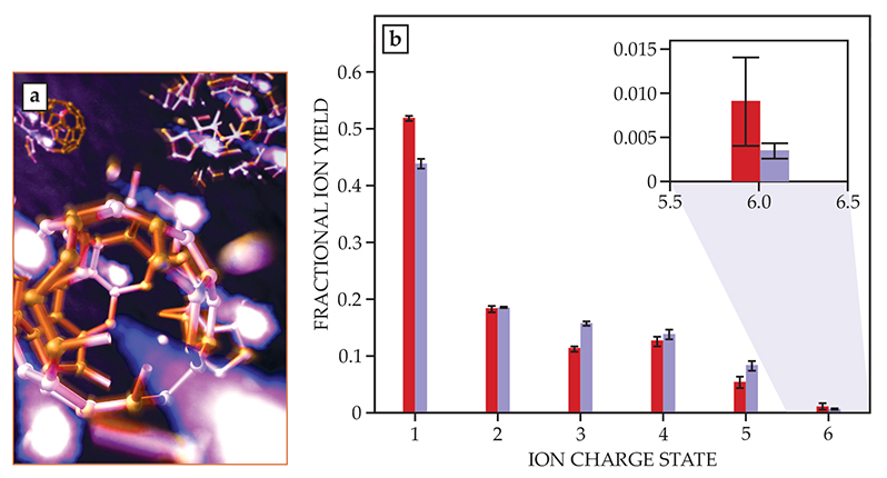 Figure 3. Ion fragmentation of fullerene molecules. (a) This illustration helps us visualize the fullerene molecules’ violent fate when they encounter the intense x-ray pulse of the Linac Coherent Light Source. Ion fragmentation can lead in some cases to carbon ions stripped of all their electrons. (Courtesy of SLAC.) The individual C-ion yield distribution (b) is shown for all charge states subsequent to C60 fragmentation. Initial theoretical models had predicted higher yields of C ions, but comparison with the experimental data revealed that a nanoplasma of trapped low-energy electrons recombined with the high-charge C states to suppress the ion yield. A refined model, shown in purple, containing that secondary effect is in excellent agreement with the measured data, shown in red. (Adapted from ref. 9.)
