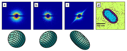 Figure 4. Diffraction images of pure helium droplets made with femtosecond x-ray pulses. (a–c) Images represent circular, elliptical, and streaked patterns, respectively, with corresponding three-dimensional representations of the droplet shapes placed below each diffraction pattern. Diffracted x-ray intensities are displayed in a logarithmic color scale. (d) A droplet outline is reconstructed from the diffraction pattern in panel c using an inverse Fourier transform. (Adapted from ref. 14.)