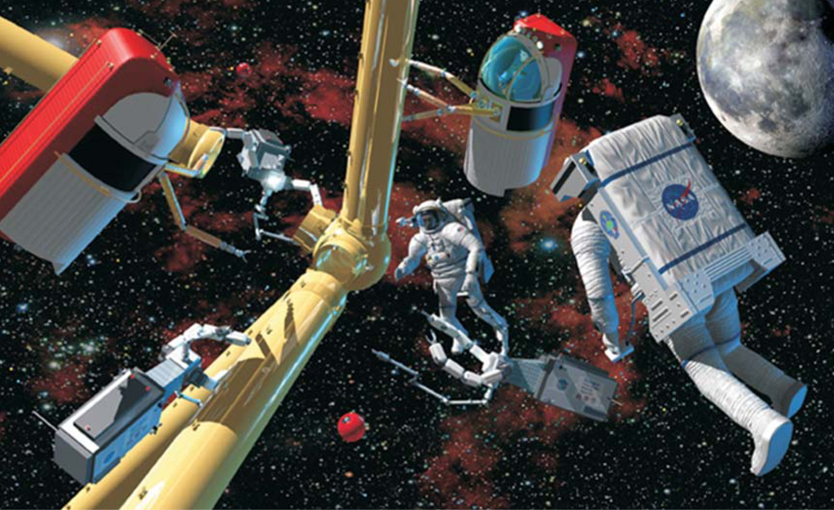 For the largest space telescopes that we envision, in-space operations by both humans and robots may enable a leap in astronomical capability. In this artist’s rendering, humans and robots assemble trusses for such a space telescope at an Earth–Moon Lagrange point, L1. The telescope might subsequently be deployed to an operations site at another location, Earth–Sun L2. Such in-space activities have more potential for astronomical discovery beyond the Moon than do lunar-surface activities.