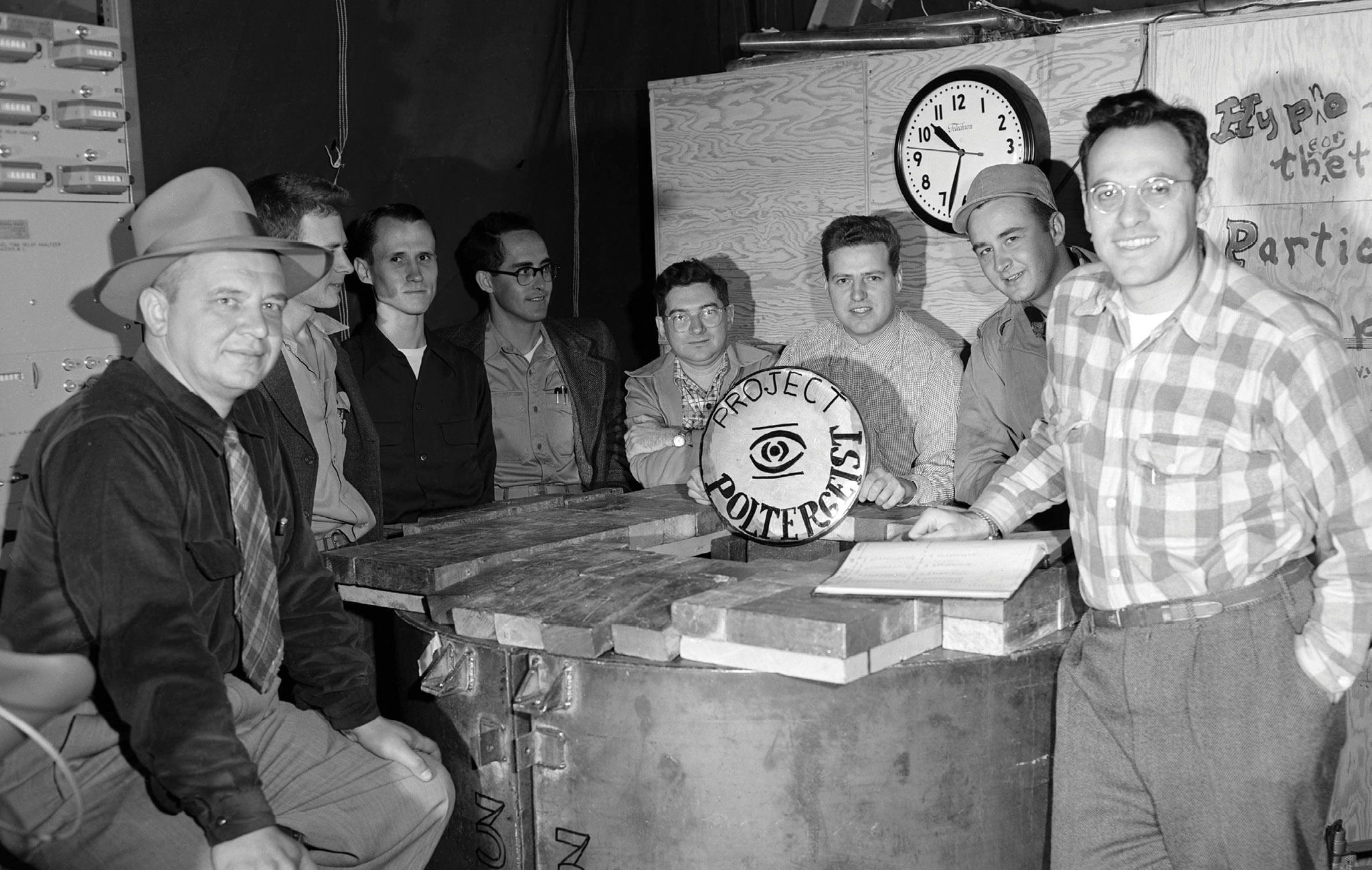 The Cowan–Reines experiment confirmed the existence of neutrinos in 1956. Clyde Cowan (far left) and Frederick Reines (far right) used large tanks of water with dissolved cadmium that were sandwiched between tanks of liquid scintillator to detect electron antineutrinos produced by a nearby nuclear reactor. (Photo from LANL/Science Source/Science Photo Library.)