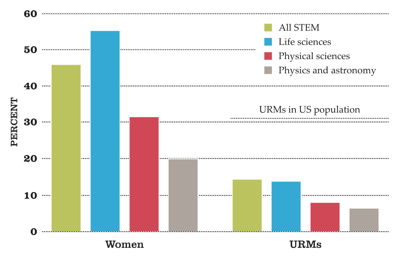 Percentage of STEM PhDs awarded in 2016 to women and to members of underrepresented minorities (URMs). Numbers of PhDs awarded to members of both groups (for example, women of color) are even lower and are not reported separately by NSF. (Adapted from ref.