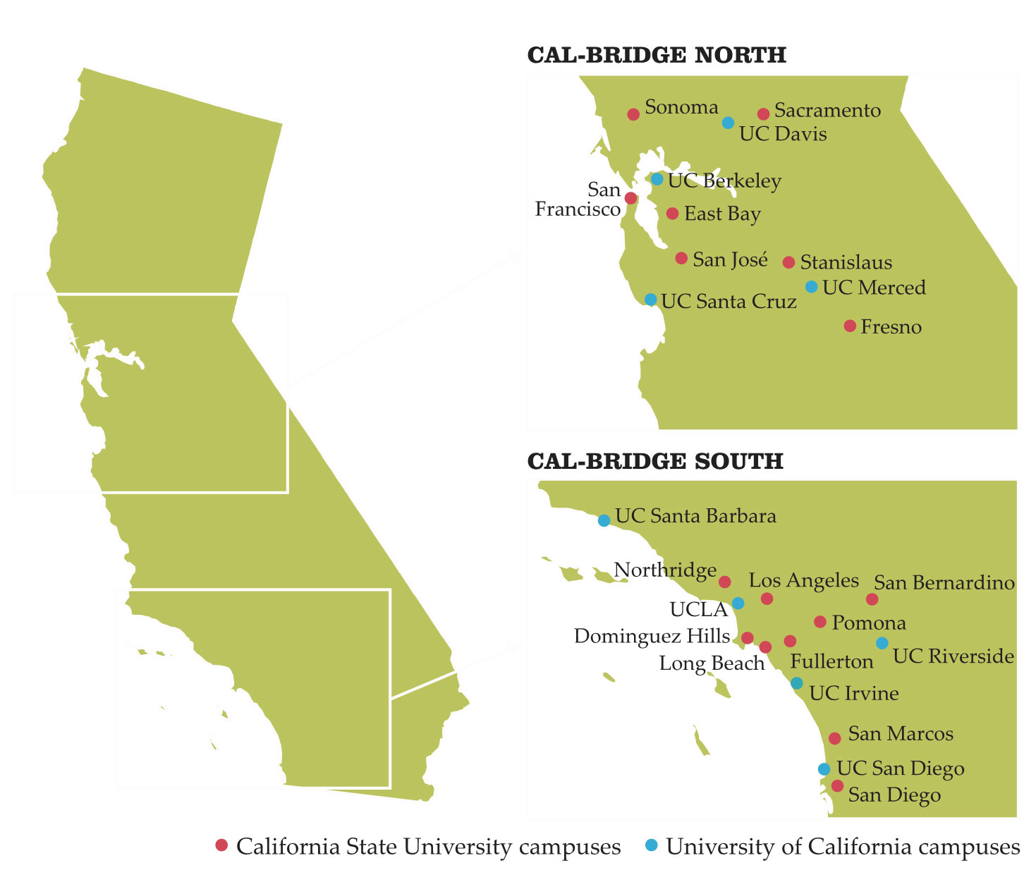 Locations of Cal-Bridge campuses.