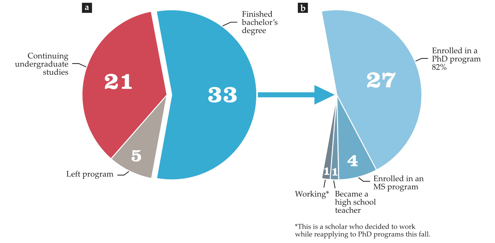 Undergraduate degree and graduate program outcomes for the 59 Cal-Bridge scholars. (a) Number of Cal-Bridge scholars who have completed their bachelor’s degree, left the program, or continue their undergraduate studies. (b) Graduate program outcomes for Cal-Bridge students with bachelor’s degrees.