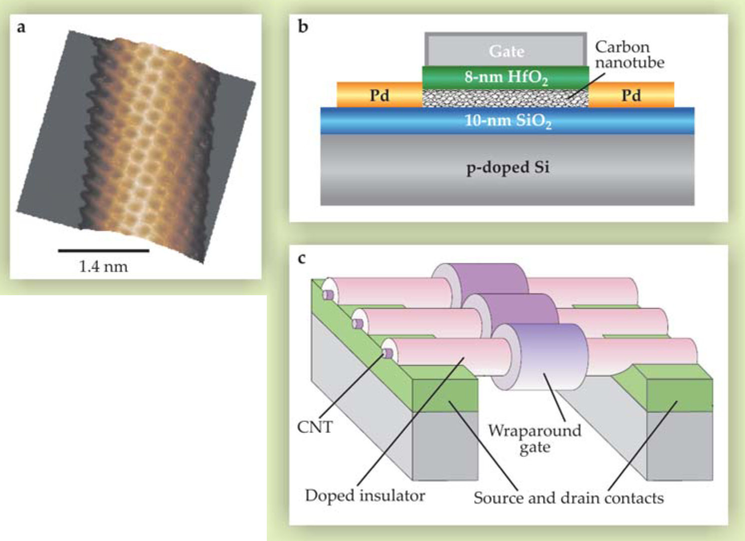Figure 1. A single-walled carbon nanotube, shown in this scanning tunneling microscope image (a), can form the basis of an FET. (b) In a top-gated configuration, a single nanotube is sandwiched between two insulating layers, hafnium oxide and silicon dioxide in this case. Palladium metal electrodes serve as source and drain. (c) In an alternate configuration, an insulating layer and metal gate are wrapped around each nanotube to optimize the gate-channel coupling. The nanotube segments away from the gate are doped.