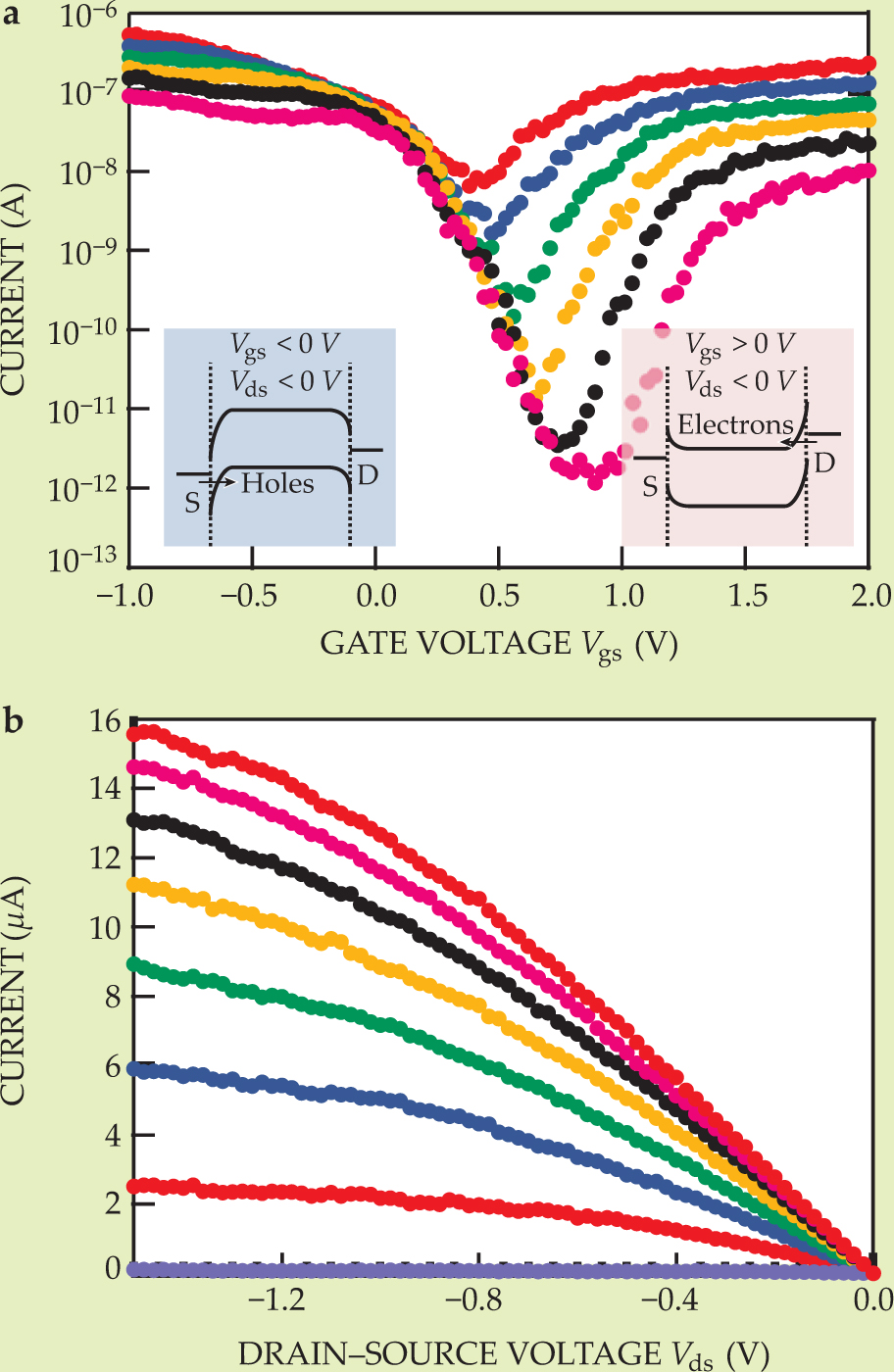 Figure 2. Charge-transport characteristics. (a) The current l d versus gate voltage V gs measured from an ambipolar carbon nanotube FET as the drain-source voltage V ds decreases (bottom to top) from −0.1 V to −1.1 V in steps of −0.2 V. The left inset shows a schematic band structure of a CNT FET under negative gate bias and negative drain-source bias. Holes are injected into the CNT from the source (S). The right inset shows the reverse: Under positive gate bias, electrons are injected from the drain (D). (b) Output characteristics of a CNT FET plotted as l d vs. V ds. From bottom to top, V gs varies from +1 V, the off state of the FET, to −2.5 V, the on state, in steps of −0.5 V.