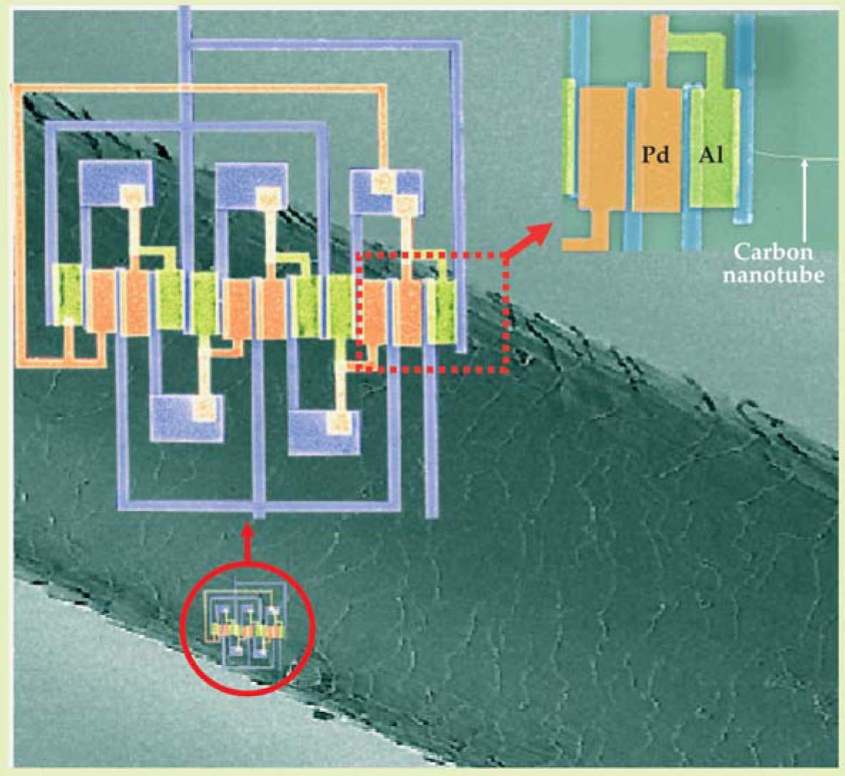 That approach was employed by IBM’s Zhihong Chen and coworkers to fabricate the most complex electronic structure so far based on a single CNT. Figure 3 shows a scanning electron microscope image of a five-stage ring oscillator in which Pd was chosen as the metal gate for the p-type FET and Al for the n-type FET.