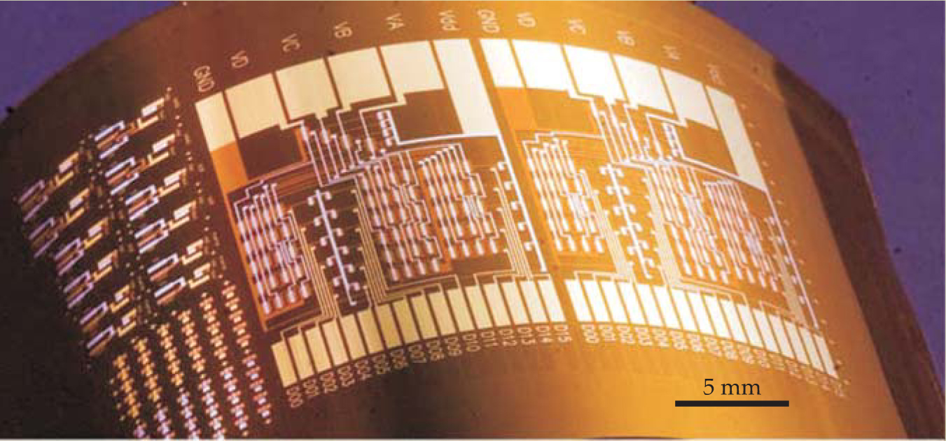 To avoid the problem, the channel is made much longer than the average length of the CNTs so that no single tube can bridge the source–drain gap. Charge transport occurs along “percolation paths,” and switching involves numerous tube–tube junctions. The technique achieves reasonably high on/off current ratios, but at the cost of increasing the channel resistance and consequently producing low drive currents. The carrier mobility is also reduced drastically, although it remains higher than that of typical organic TFTs. Furthermore, the nanotubes can be deposited at low temperatures on a variety of substrates for various applications, one of them pictured in figure 4.