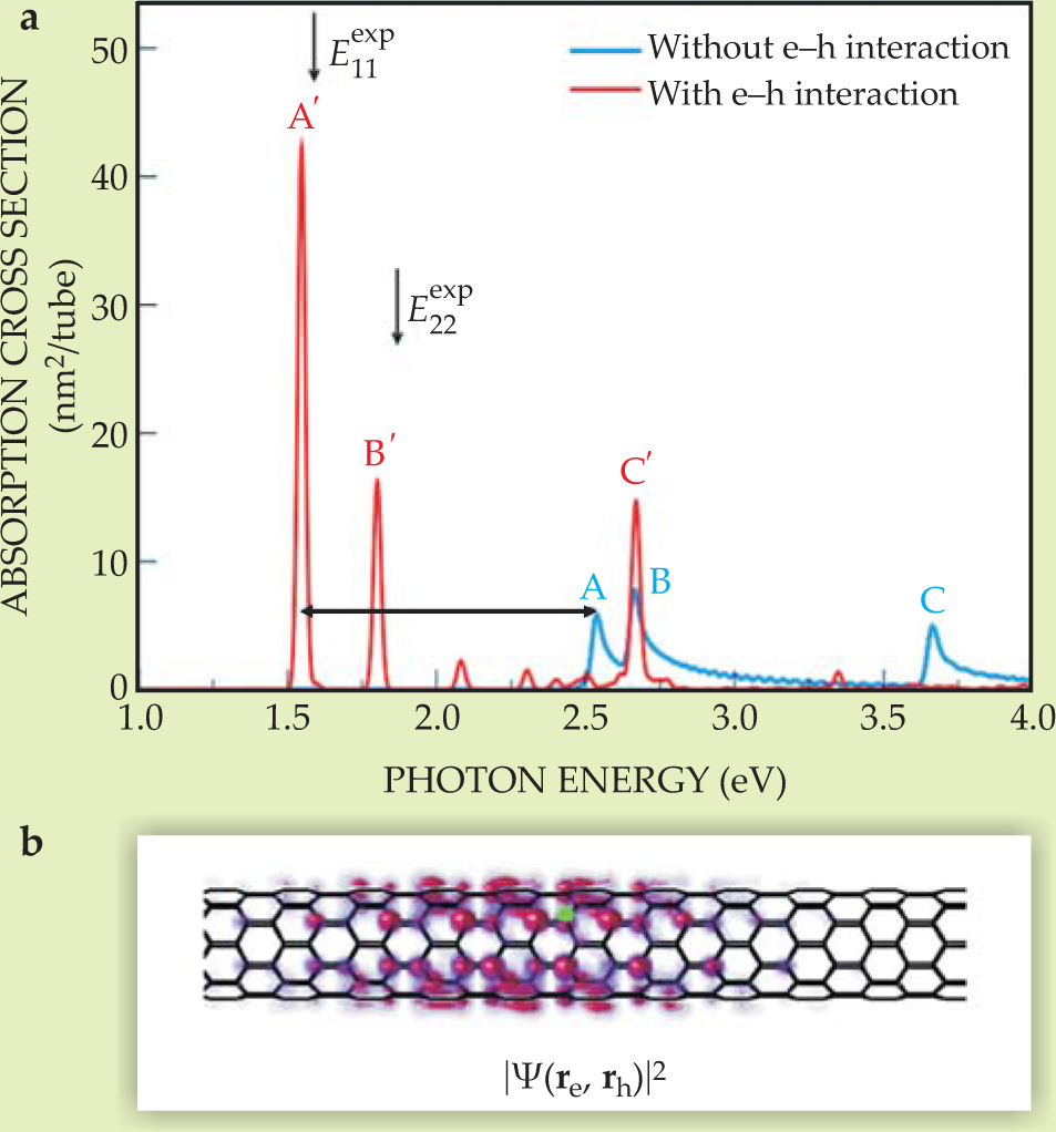 Figure 5. (a) Ab initio calculations of the absorption spectra of a single-walled carbon nanotube. The electron–hole (e–h) interactions are included in one case (red) but not in the other (blue). The energy and intensity differences between the three lowest interband transitions (A, B, C) and the corresponding exciton states (A’, B’, C’) indicate the pronounced effect of strongly bound e–h pairs in a nanotube. E 11 and E 22 signify the transition energies experimentally observed using light polarized along the nanotube axis. The energy difference between the first red and blue peaks (shown by the black horizontal arrow) gives the binding energy of the first exciton. (b) A real–space representation of the e-h pair probability distribution, |Ψ(r e, r h)|2, as a function of the electron position r e when the hole position r h, the green dot, is fixed.