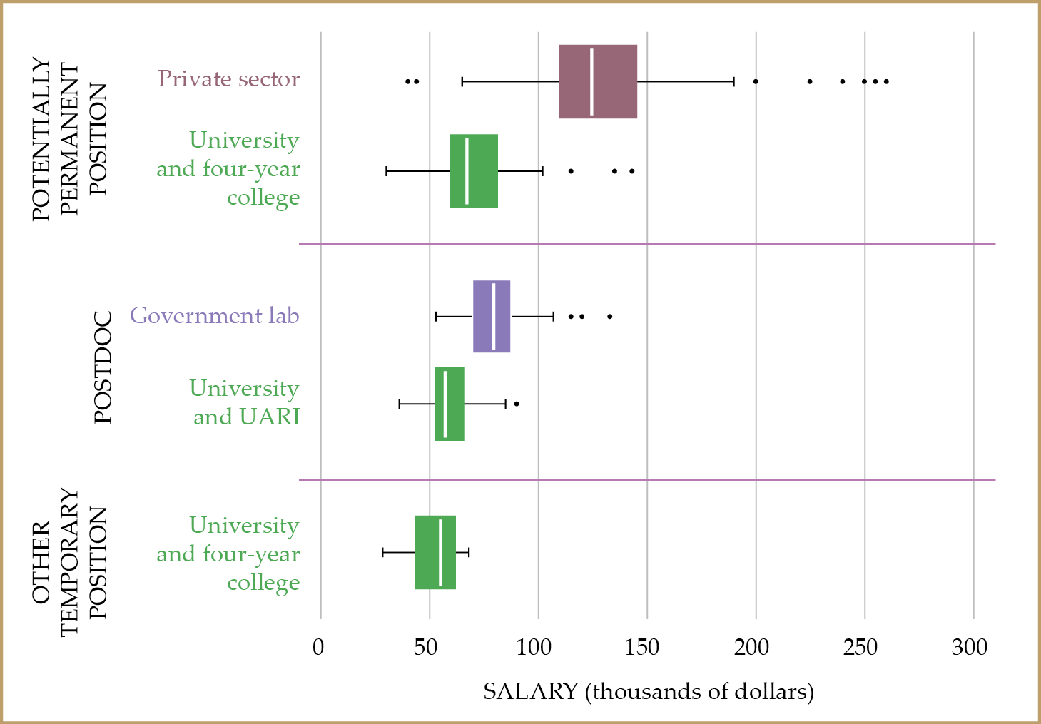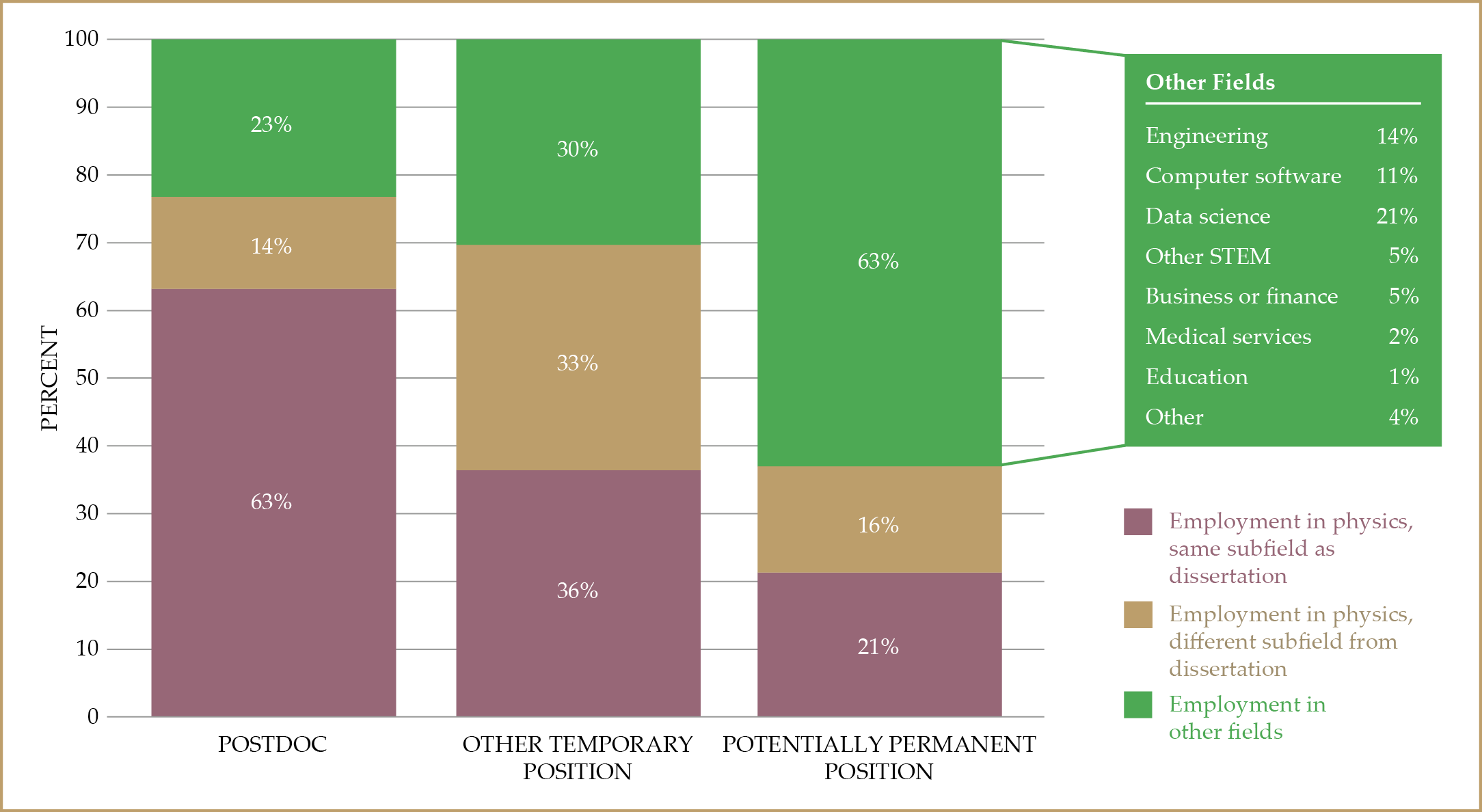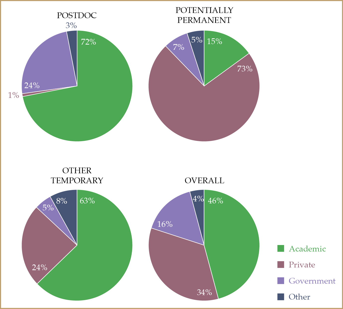 Postdoctoral researchers primarily go into academia or government, and they generally stay in the same subfield. Private-sector jobs tend to pay the most and temporary positions the least.
