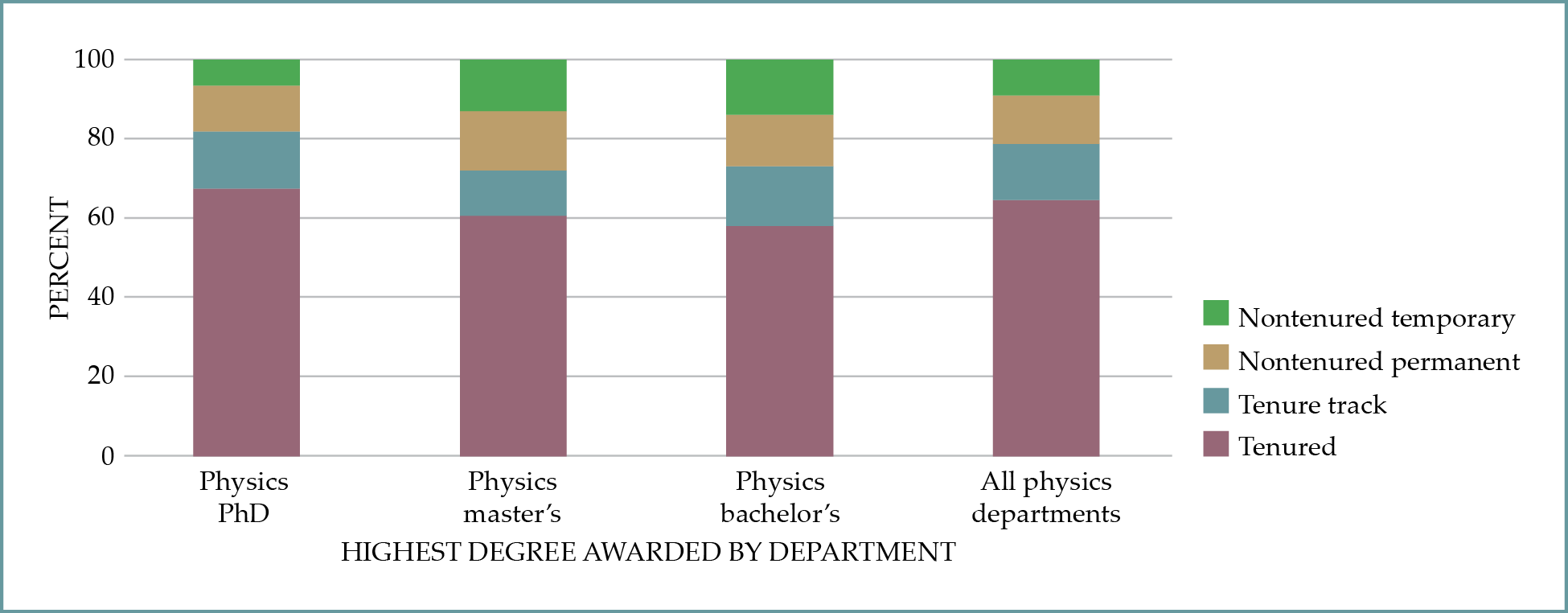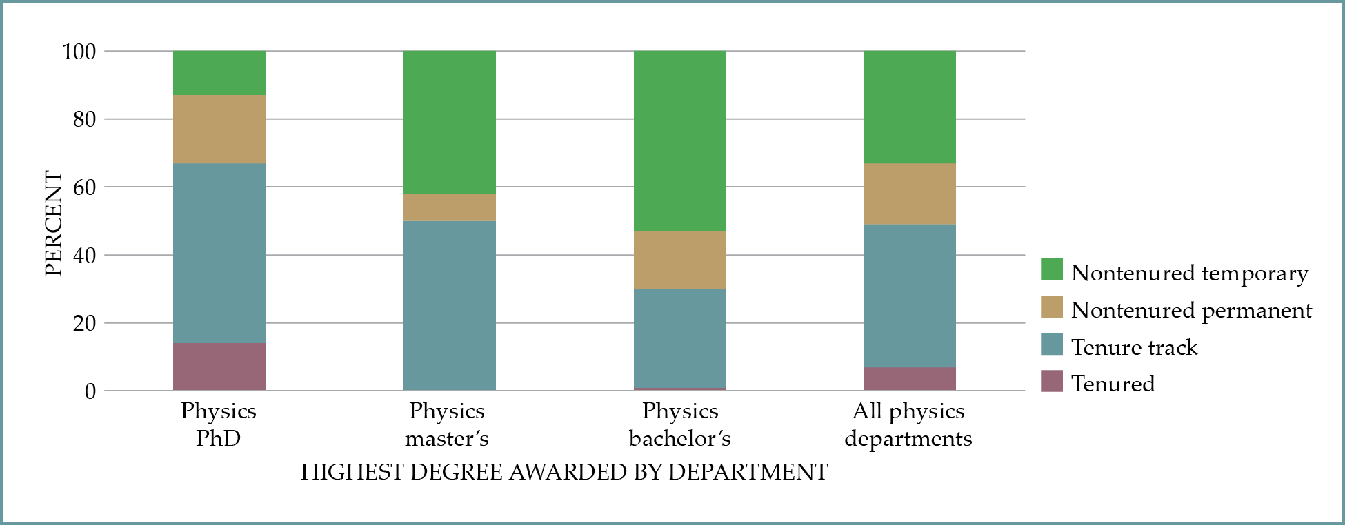 Tenure status of current physics faculty members, according to the highest degree that the department awards. Here the data include anyone engaged in teaching or research in the 2021–22 academic year. (Courtesy of Anne Marie Porter; data from the 2022 AIP Academic Workforce Survey.)