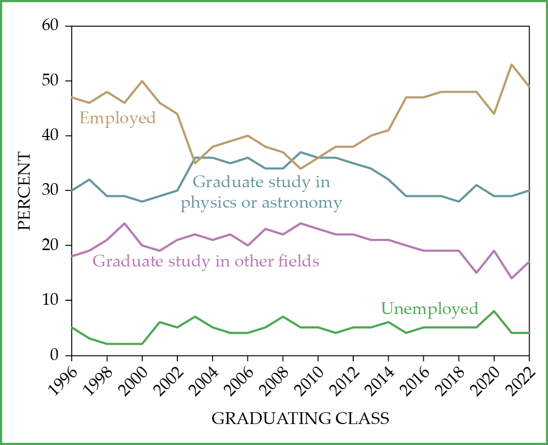 Nearly half of all new physics bachelor’s recipients in the classes of 2021 and 2022 reported that they entered the workforce. A majority of the positions in the private and public sectors were in STEM. Of those who continued on to graduate school, roughly two-thirds were in physics or astronomy. Engineering is the next most popular field of study for physics bachelor’s recipients; other common areas include math, computer science, education, business, law, and medicine.