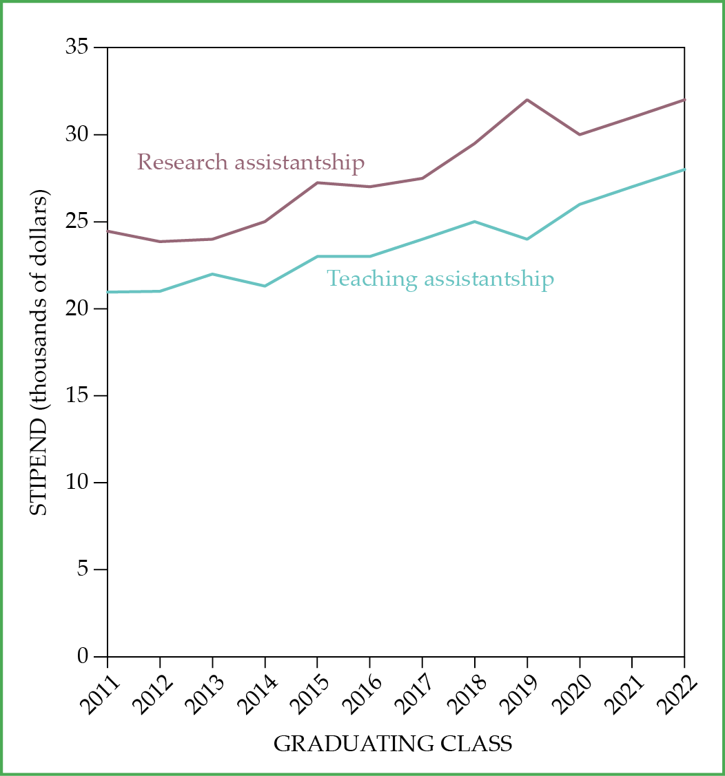 Median graduate student stipends. The overall stipend increases from 2011 to 2022 are slightly below the US median earnings increase during that period for all individuals with a bachelor’s degree or higher,2 and the median stipends are lower than the median starting salaries for physics bachelor’s degree recipients who entered the workforce. (Courtesy of Jack Pold and Patrick Mulvey; data from degree-recipient follow-up surveys conducted by AIP Research.)
