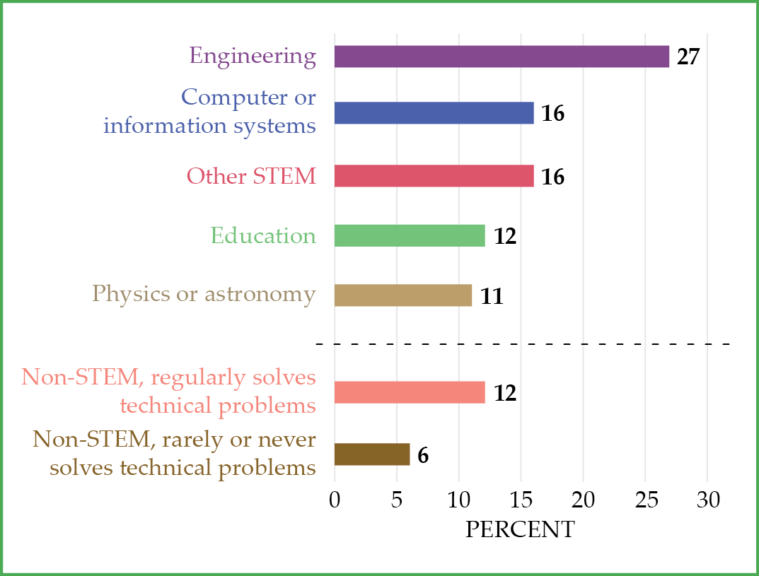 What working physics bachelor’s recipients do, in the winter after getting their degree from a US college or university, classes of 2021 and 2022 combined. The data reflect all employment sectors. “Regularly solves technical problems” includes respondents who selected “Daily,” “Weekly,” or “Monthly” on a four-point scale that also listed “Rarely or Never.” (Data from AIP Research, Physics Trends: Field of Employment for New Physics Bachelors, 12 September 2023.)