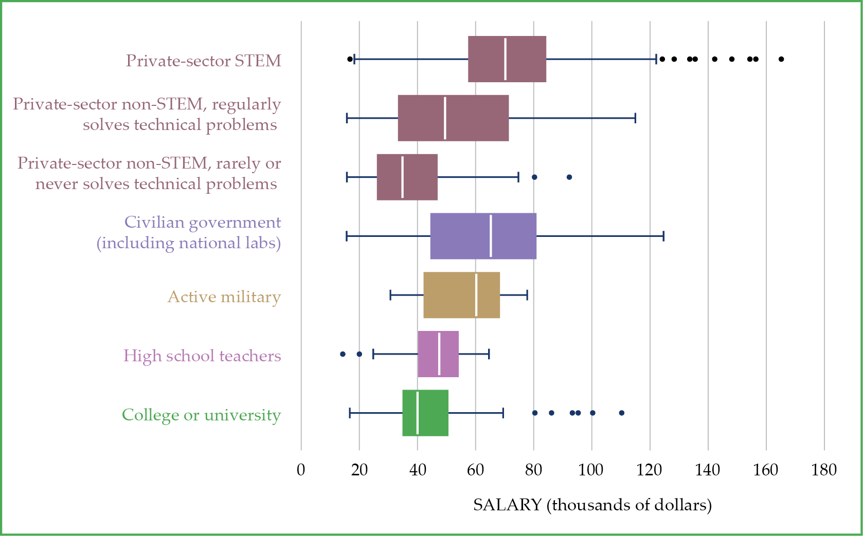 What working bachelor’s recipients make. Starting salaries are for full-time employed, US-educated physics bachelor’s degree recipients from the classes of 2021 and 2022 combined. In this box-and-whisker plot, the boxes represent the middle 50% (25th to 75th percentiles) of salaries, and the vertical line in each box is the median salary. The lines extending to either side of the boxes denote the starting salary ranges excluding outliers, which are indicated by the dots. (Data from AIP Research, Physics Trends: Starting Salaries for Physics Bachelors, 12 September 2023.)