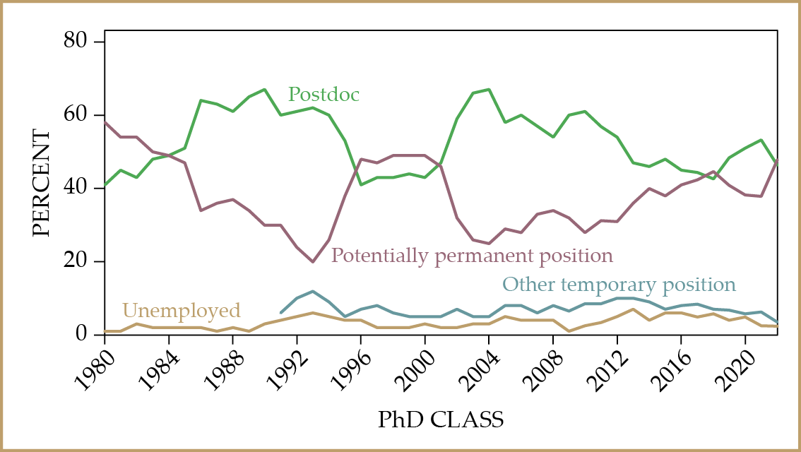 Employment status of new physics PhDs, in the winter after receiving their degree. The data are for those who received their PhD degree from a US institution and remained in the US. The 1991 survey was the first to include “other temporary” employment as a separate category. (Courtesy of Jack Pold and Patrick Mulvey; data from degree-recipient follow-up surveys conducted by AIP Research.)